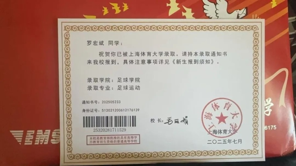 IM电竞官方网站罗宏斌被上海体育大学录取